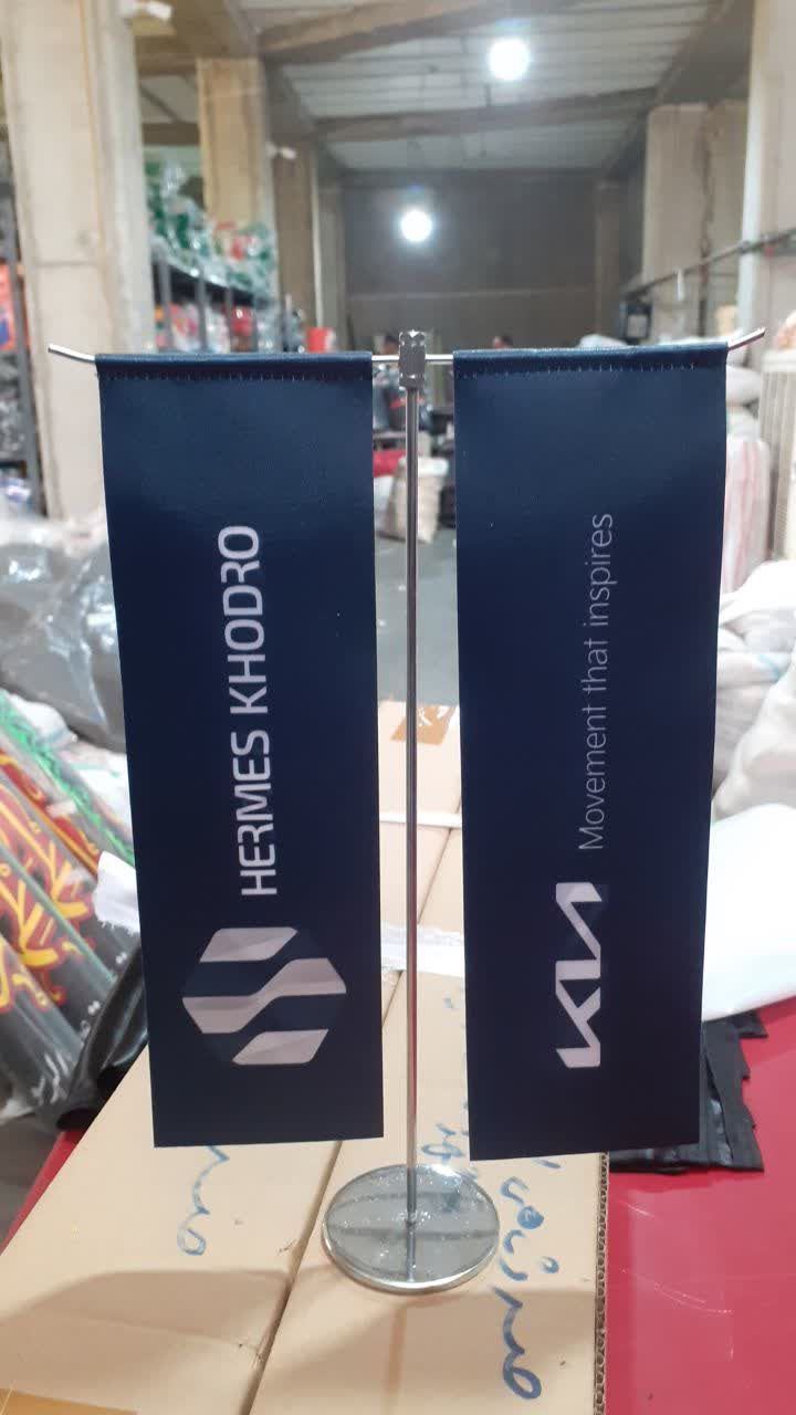 پرچم رومیزی مدل تی ( T ) به علت ظاهر جدید خود با استقبال بالای مشتریان مواجه بوده است، جنس پارچه آن ساتن کره ای می باشد که چاپ به صورت پشت و رو و دیجیتالی بدون محدودیت رنگ بر روی پارچه انجام میشود.